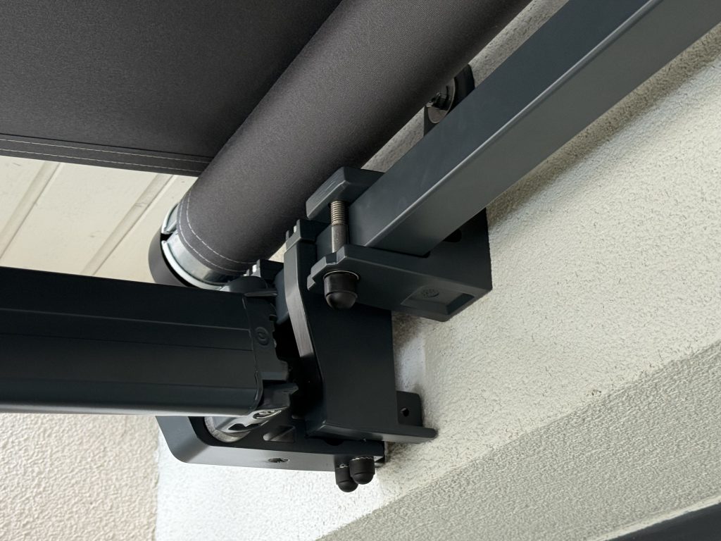 Installation d’un store banne à bras croisés avec lambrequin enroulable à Herrlisheim à côté de Husseren-les-Châteaux.